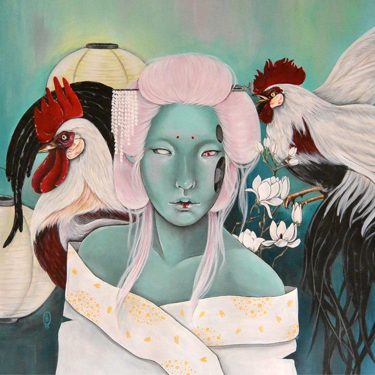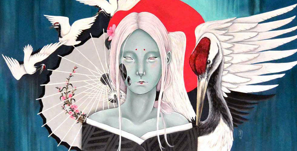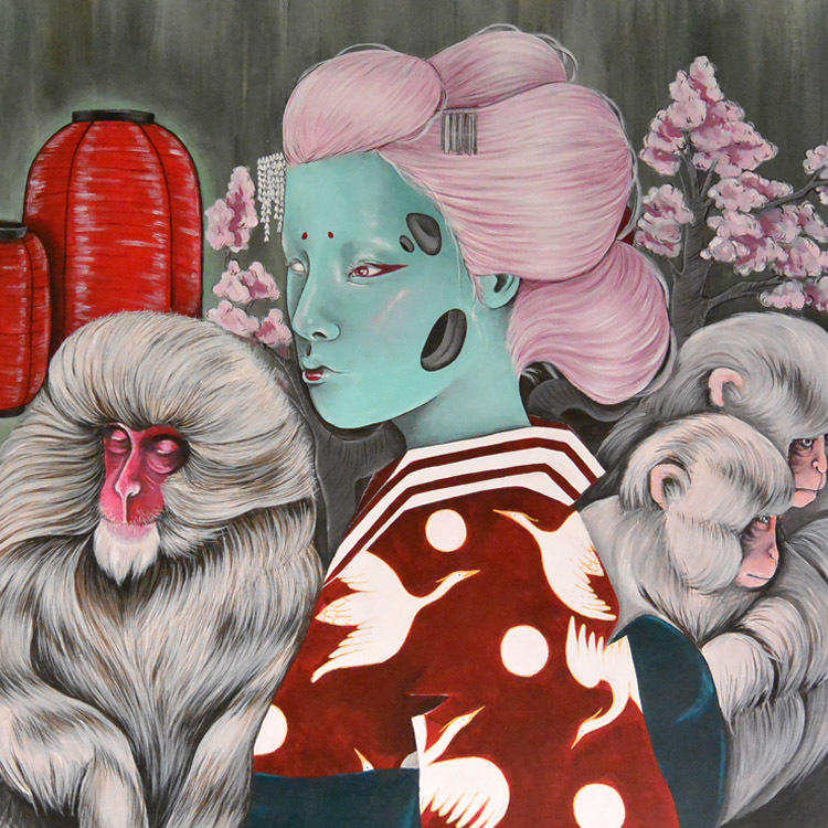 “Combining her soft spot for the low-brow art movement with its humorous, pop surrealistic imagery and its roots in underground comix, punk and surf culture with her fondness for Japanese pop culture and its rich traditional heritage, Barcelona based artist Okokume gives the image of the Geisha a new appearance.”