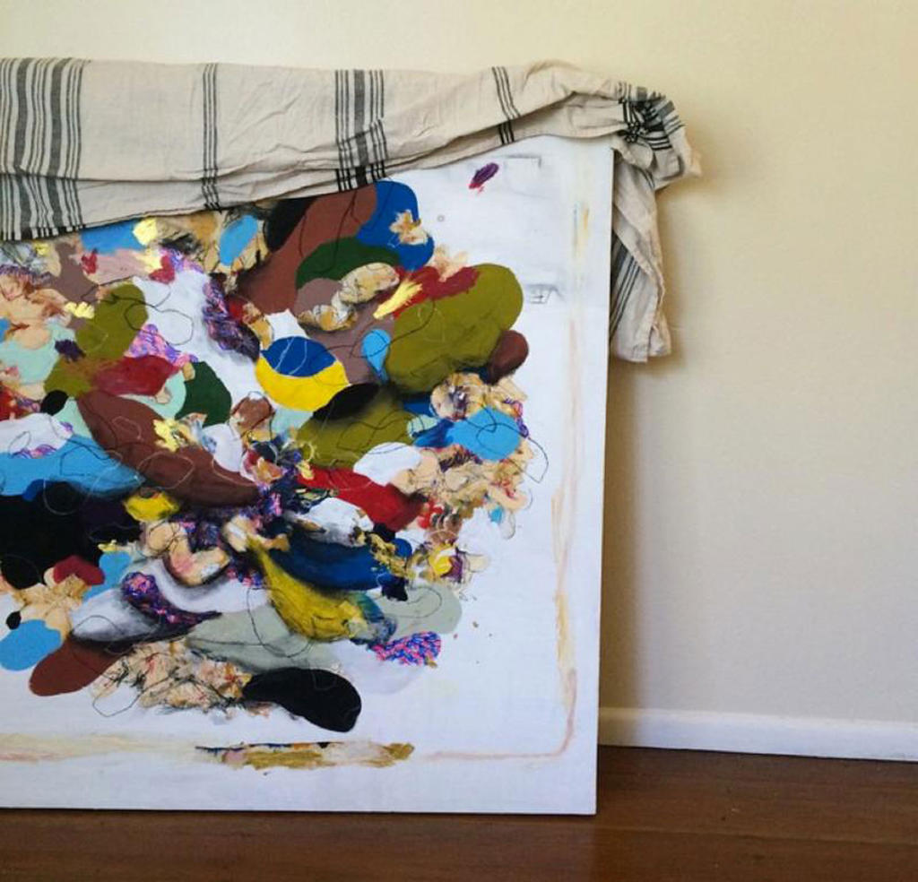 Utilizing a combination of work including large-scale mixed media paintings, over 100 smaller abstract studies on wood, delicate mixed media works on paper, and countless re-purposed vintage vinyl albums, “Overgrown” proves to be indeed a lush environment of creativity.