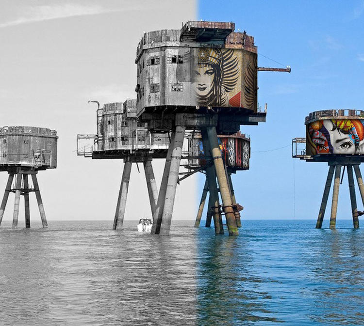 Artist Tristan Eaton is the driving force behind this ambitious project, as he assembled Shepard Fairey, Futura 2000, How & Nosm, and The London Police to paint the historical Red Sands Sea Forts located in the very rough North Sea. Check the official Kickstarter site here.