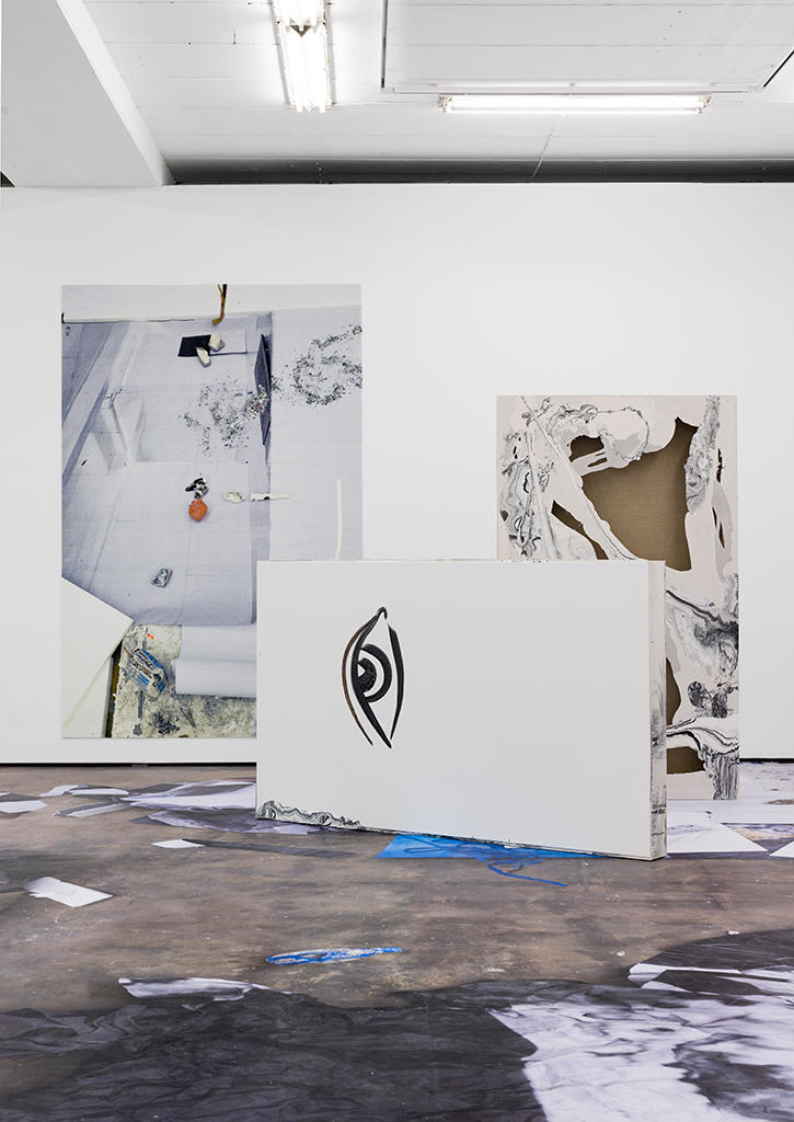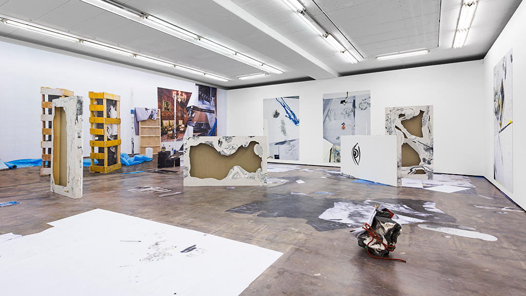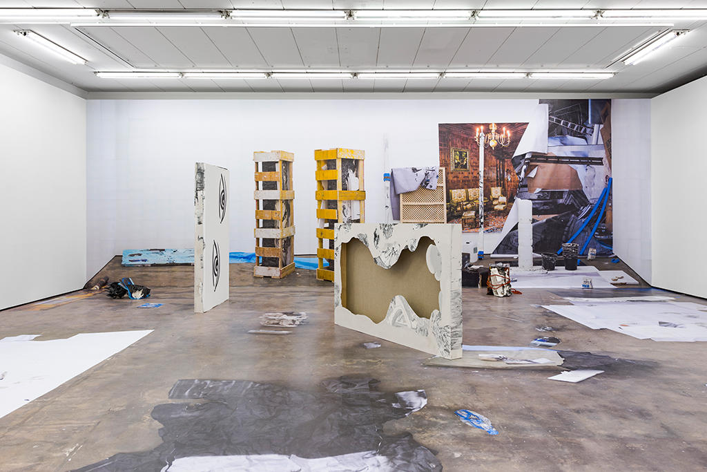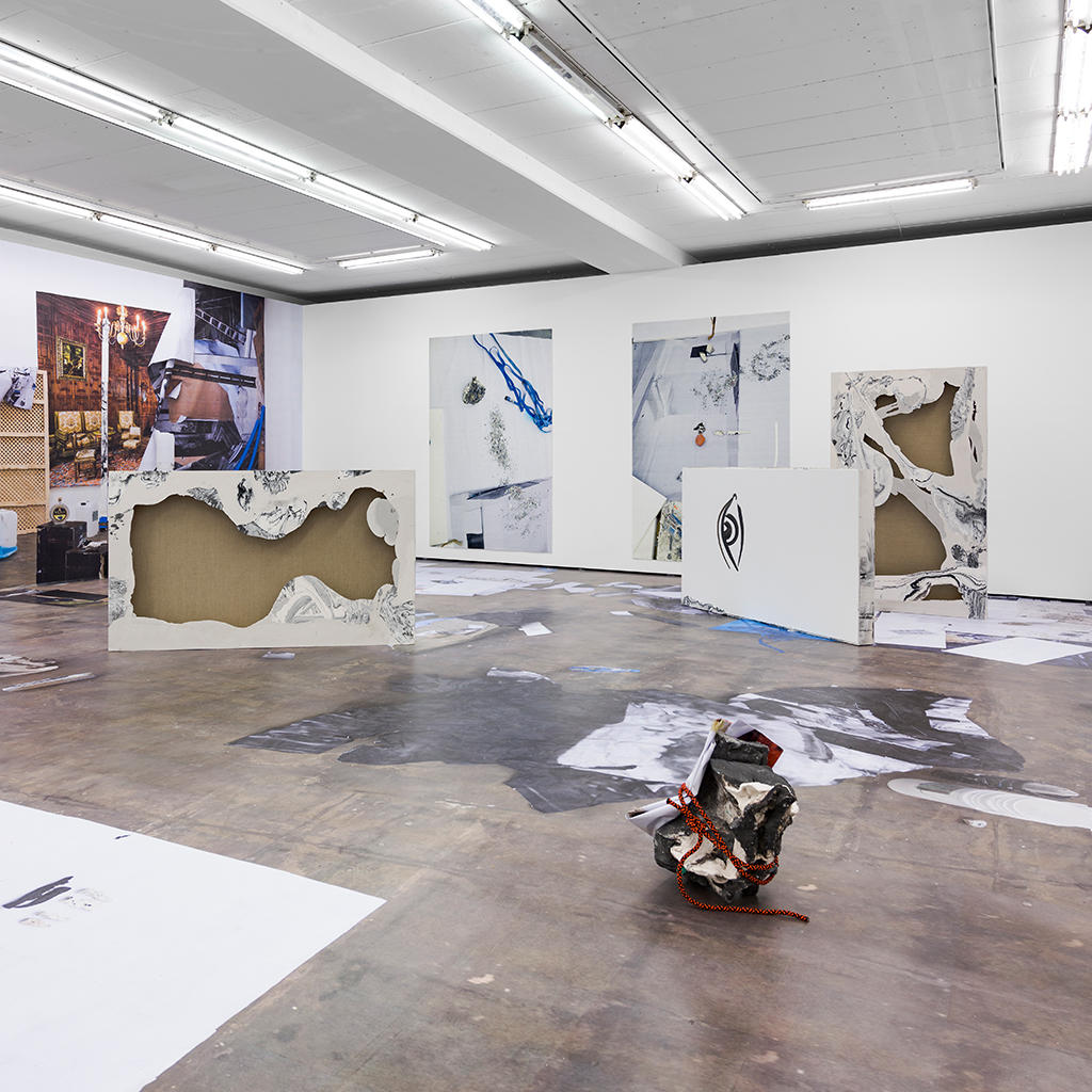 At WENTRUP, the new show 1EYE 2EYES includes a complete re-staging of the gallery space. New sculptures, photographic wallpaper, Jesmonite objects, carpets printed with photographs, and paintings form an all-embracing installation whose motifs have been generated from images previously recorded within the very same gallery space.