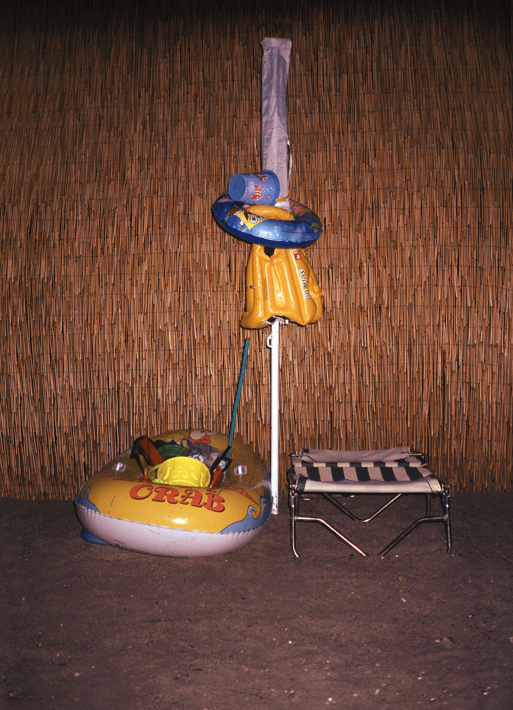 At the beginning of summer vacation tourists save their spot at the beach of Terracina. Marked with a sunshade. The site is claimed during vacation and meeting point for the entire family. Every evening they arrange and fix their numerous beach stuff around the sunshade. Secured for the night.