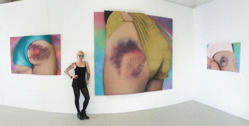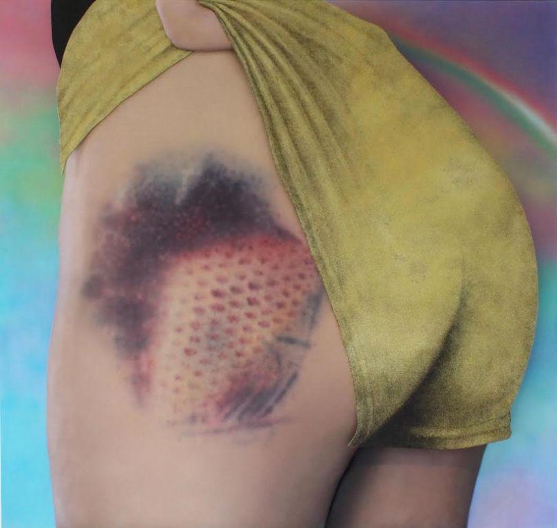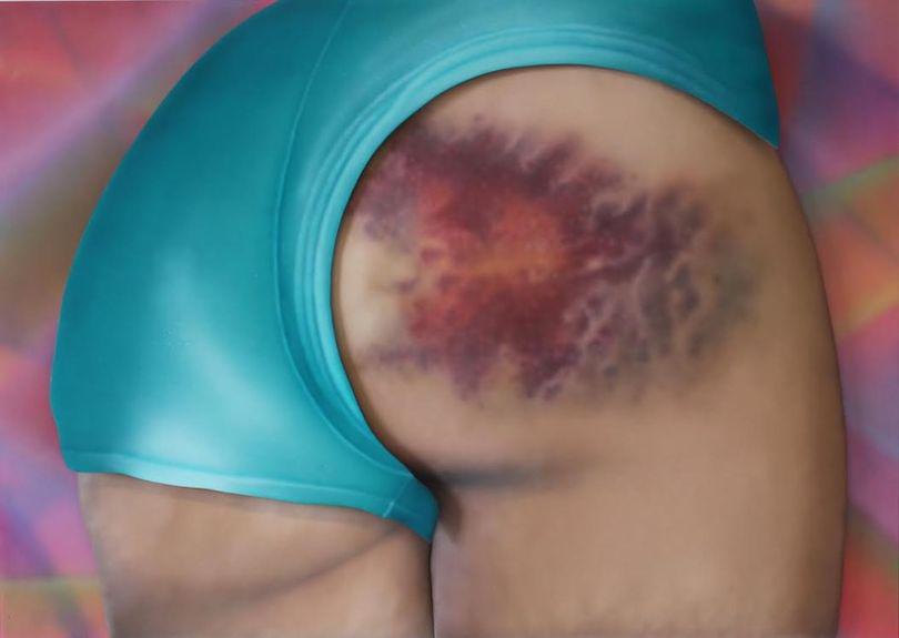 Finnish artist Riikka Hyvönen has started to get interested in bruises through collecting photographs of roller derby girls’ butts. Roller derby is not just a competative race, it’s a rather physical sport as well since it’s mainly about contact. Riikka called these bruises “kisses”, and created an exhibition out of it called "Roller Derby Kisses". With a kind of Pop Art view, the artist managed to turn these bruises into powerful images with wonderful and tight butts, mixing photography and painting to reinforce the colours.