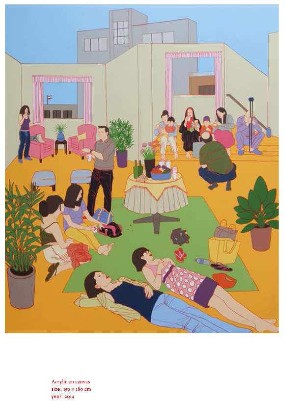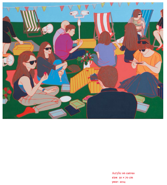 Romisa Sakaki represents the uniqueness of the YPA generation of artists, whose works are characterized by progressive, outward-looking tendencies, energetic and powerful visual language and a shift toward universal and intimate experiences. She creates vibrant paintings, which tackle a variety of modern day phenomena. On the one hand, her works are socially engaged, depicting society and her urban surroundings in Teheran. On the other hand, she presents us with experiences that are relatable to young people everywhere, questioning universal themes of life in the city and the sincerity of human relations.