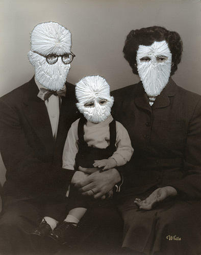 In her new series entitled “Sewn Drawing”, Jessi kept working around the concept of home and it’s residents. This time, she masked people on old family portraits with sewing to embody the metaphor of the human need to “keep it together” and prevent life from “ripping apart at the seams”. This unusual technique is also a way to reclaim the photograph as a unique and handmade object.