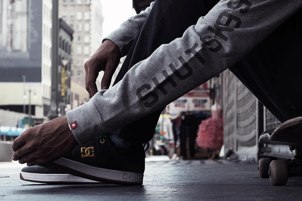 DC partnered up with legendary New York City sk8 company SHUT, to introduce the DC X SHUT Collection. The collection features the Lynx Prestige S SHUT and includes details like the classic “SHUT Shark” sublimated graphic on the sockliner, 3M reflective lacing and adds SHUT tags on the heel counter as well as t-shirts and fleece with the classic "SHUT Shark" artwork.