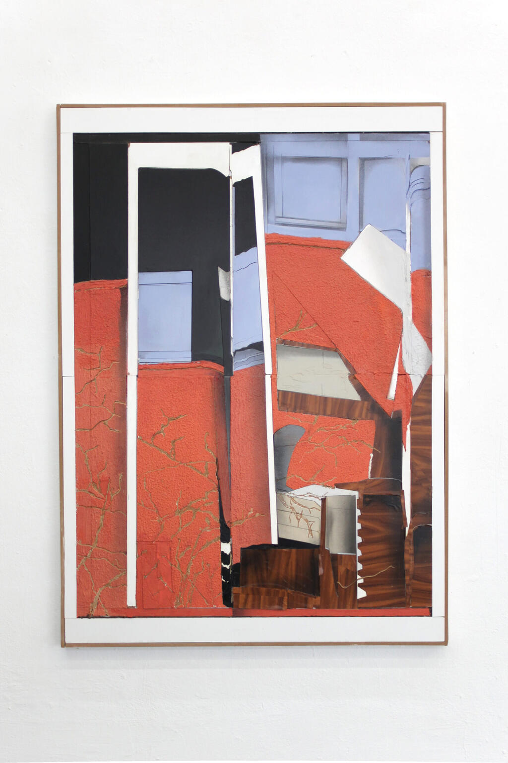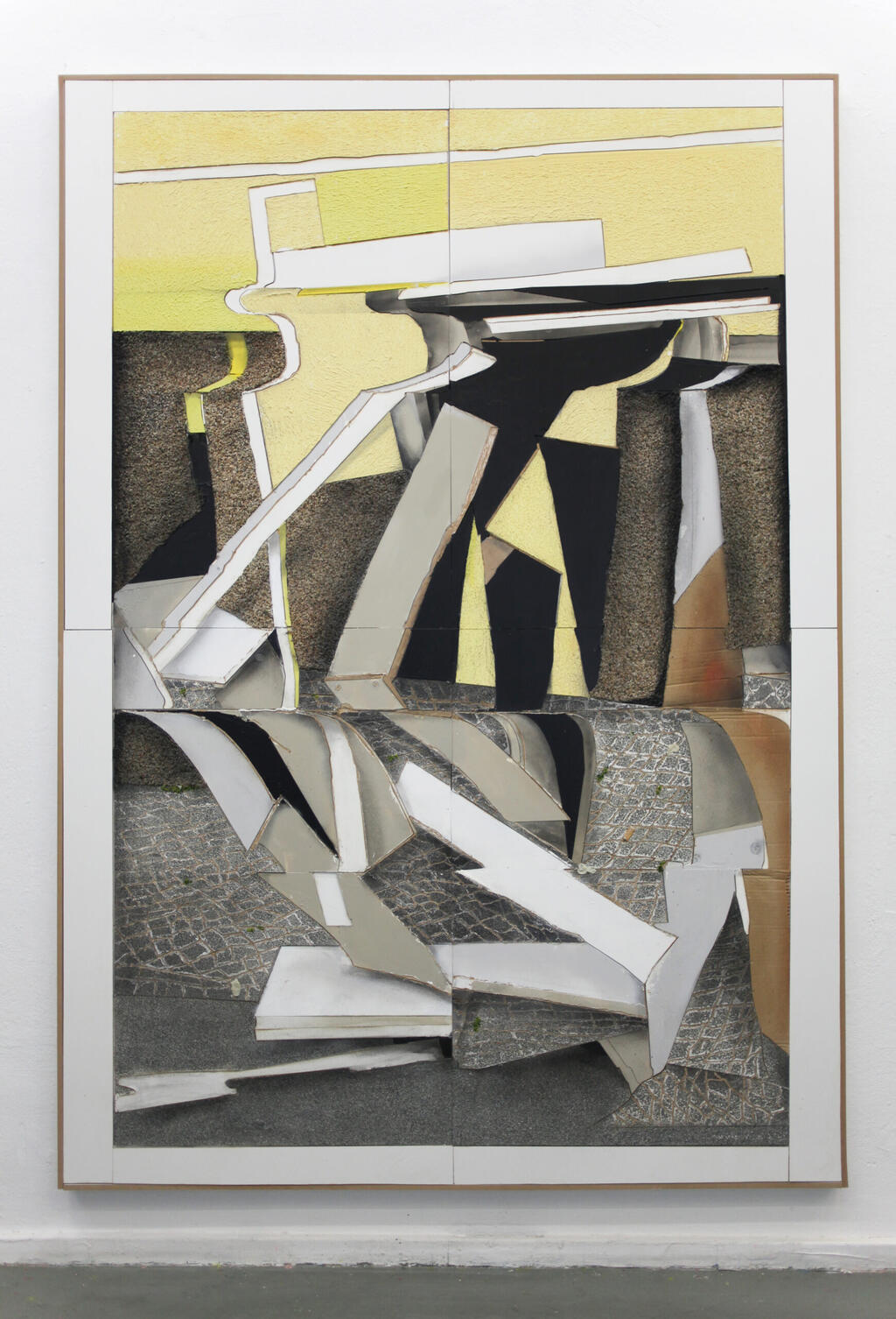 Following his earlier practice of reconstructing the found material on site and then documenting the sculptural result, today the artist reverses the process. The photo of the scenery is printed twice, collaged anew and then scanned in again to be reproduced as a wall piece true to the material. Or to put it another way: here, a piece of the city is cut out, turned inside out and reproduced as a simple abstracted still life. The refined refurbishment, if you will.