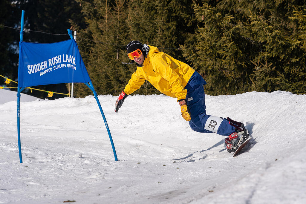 The 8th Suddenrush Banked Slalom LAAX will take place from 3-5 March 2023 in LAAX, Switzerland. The "Banked" is a snowboard race against time. On the one hand, the statement seems unusual for the world’s leading freestyle resort, as the many snow parks in the area of Flims-Laax-Falera invite you to jib and trick with style and without speed requirements. On the other, it is the most natural thing in the world, as it comes from "banked", the steep turn! And this was all back in the days when snowboards didn't have edges and uneven terrain was used to gain momentum and go downhill. Whoever did this best had oodles of fun and was already at the top back then! Banked is therefore considered the most original snowboard discipline.