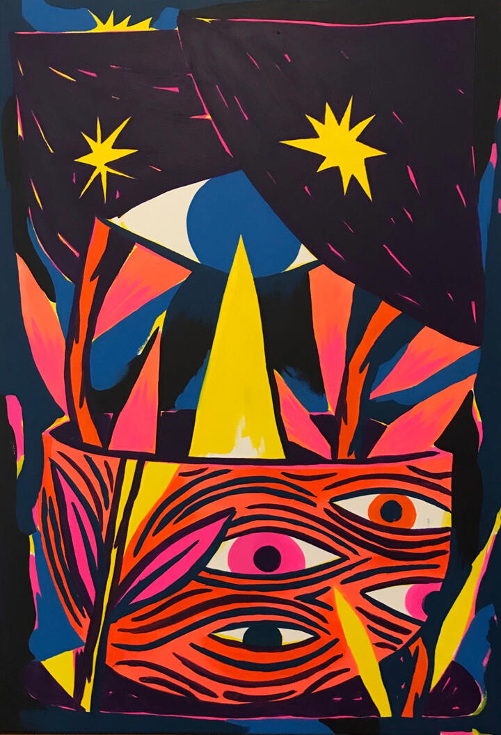 “In bursts of neon paint, Osterholt configures symbolic odes to our human condition and mortality. Through his use of vivid and unnatural colors, elements of nature, the celestial and the otherworldly are transfigured into warning signs, as if illuminated by the prophetic glow from an explosion elsewhere. Like a heatwave in fall, the paintings whisper age-old fables in the flicker of pink-orange candle light: an ancient cycle of birth and destruction binds humanity and the natural world. Osterholt also presents a series of ceramic masks which reference both the traditions of ancient ceremony and ritual, and hiding in plain sight. These themes are unified in the glow of a lightbox installation, which features in the show as a symbolic gesture towards the tension between light and dark.“