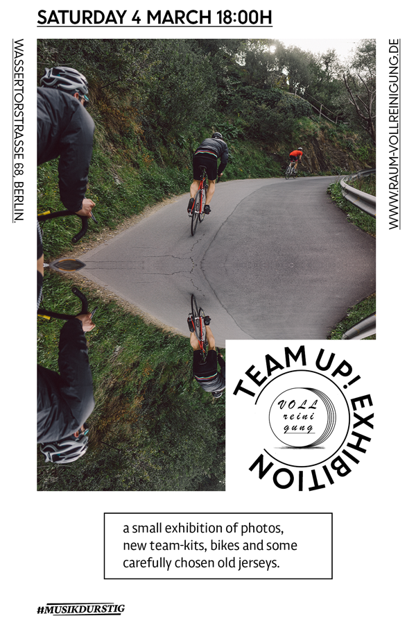 "TeamUP!“ presents a small exhibition of photos, new team-kits, bikes and some carefully chosen old jerseys. The exhibition at “Raum Vollreinigung” will be shown parallel to the Berliner Fahrradschau. The exhibition starts at 6pm with music and drinks.