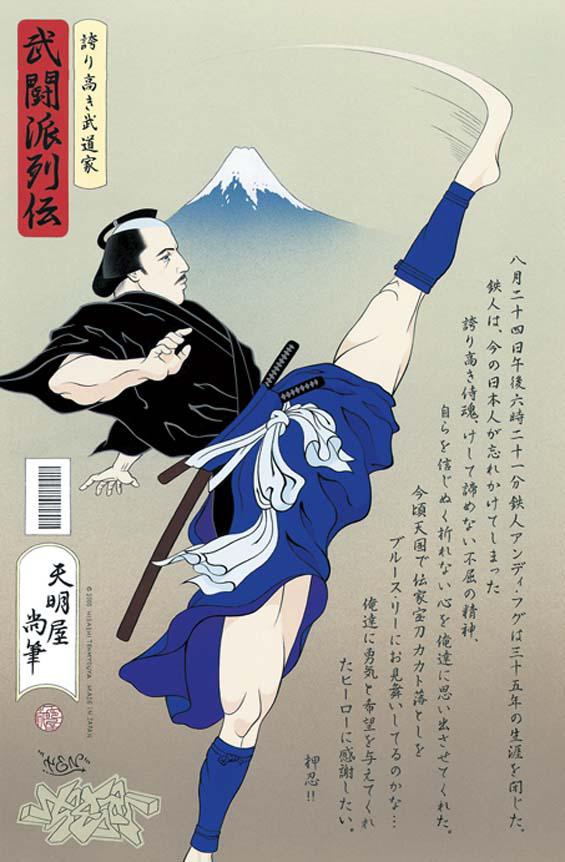 Indeed, he is bringing together the traditional Japanese art with the Western learning and Hip-Hop influences. He seeks to renew the old with the new by celebrating the history of the Japanese culture but with a new modern lens. In this way his paintings are samurai playing soccer, armour-clad animals, and a Japanese/American street “dance-off.”
