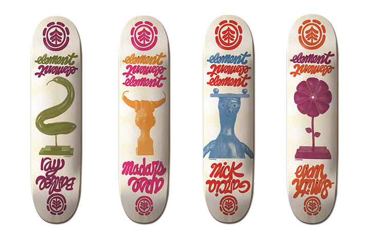 Thomas Campbell has been an advocate and brand representative of Element for almost 5 years. He just released his latest line of board graphics, utilising some quite original techniques as multi-disciplinary artist. T-Cam casted several sculptures out of bronze and matched them to the team rders. By juxtaposing one of the most ancient practices of art with modern humour, he catapults it into the 21st century on skateboards.