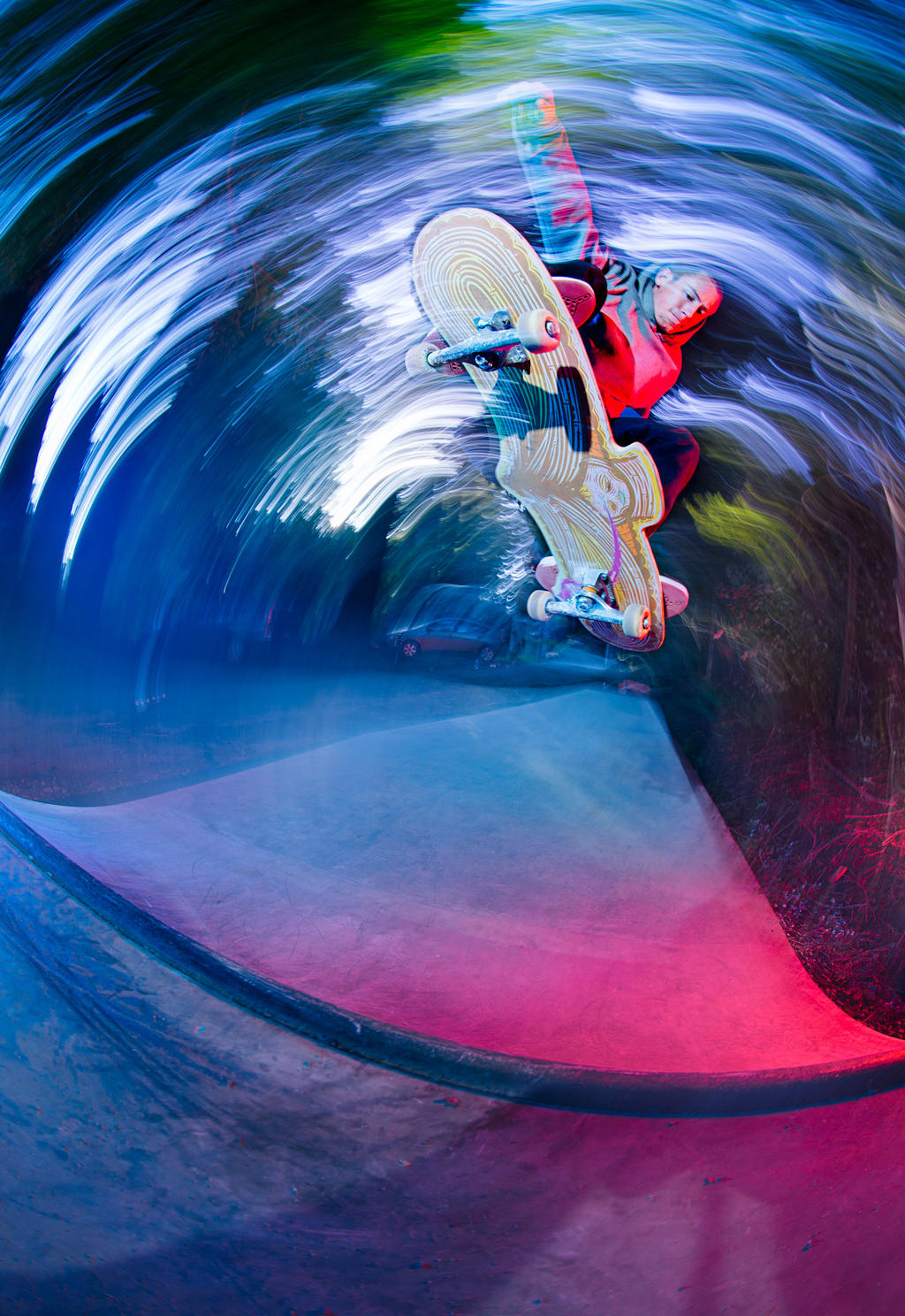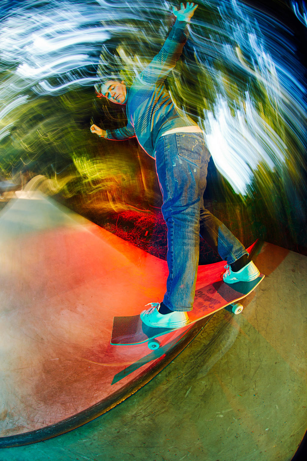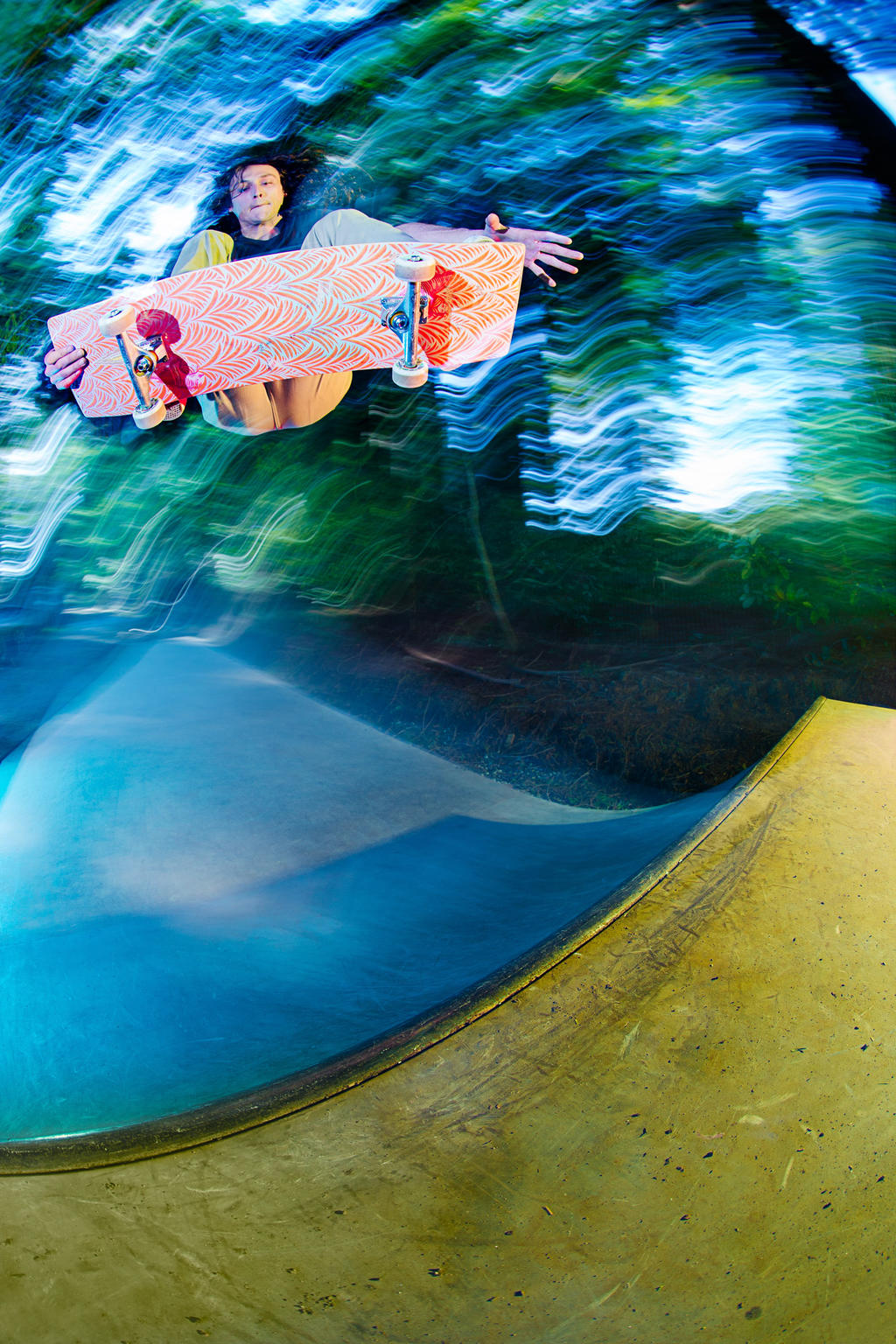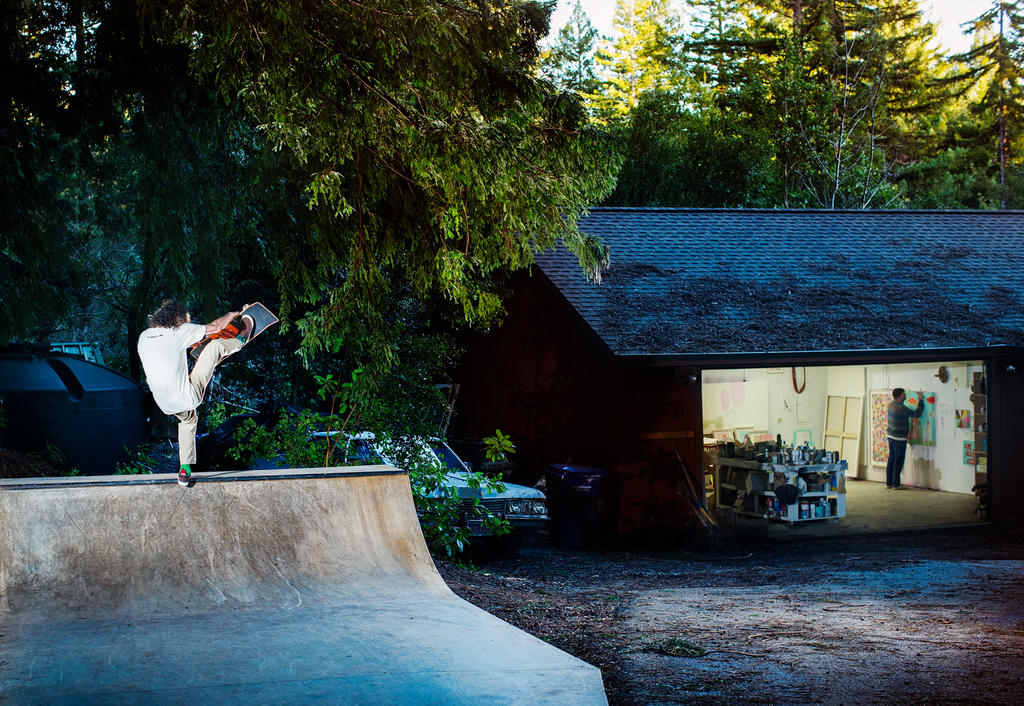 “Here is a picture of good bud Evan Smith shredding my new quarter pipe in the front yard, double grab jammy like the rip grip monster. I had the pleasure of having Evan and Brandon Westgate over for a shreddy day. We were skating the weird boards from my Element 'Wompus" collection. Evan is one of my favorite ever wildbeasts in skateboarding. What a fuckin freak, pure creation every moment. There will be a video dropping next week I think about the process of the collection and shreddy weirdnesses. This pic was taken by Brian Gaberman who is an amazing photographer. Brian was one of my young fledgling photographers when I was a photo editor at skateboarder magazine. Back then he was inspired by my wild color gel, long exposure approach to skate photography. So, when we did this shoot, he tried to emulate that old style. And of course he did it better than I ever did, because he is the man. I am constantly inspired by Brian.”