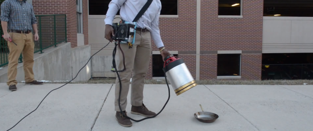 The machine is small, not that heavy, the size of a 5L keg, drumming out sounds waves which is more a low hum than really something to listen to. It's like blowing the fire out, because sound waves are basically multiple, regular blasts of air.