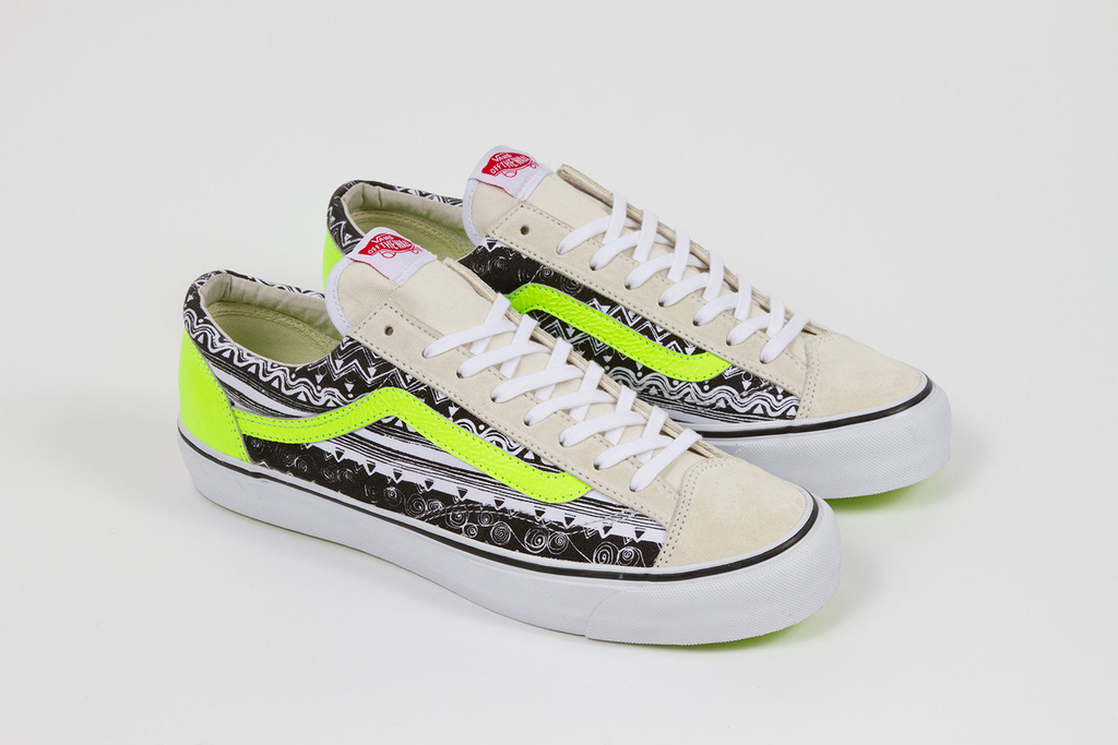 Utilizing the original design specs of the Old Skool, the Stüssy Tom Tom print is revived on the OG Style 36 LX. First drawn by Shawn Stüssy in 1986, the Tom Tom pattern reappears on the medial and lateral sides of the skate lace-up. Soft suede and neon green overlays further emphasize the Style 36's new wave-inspired aesthetic.