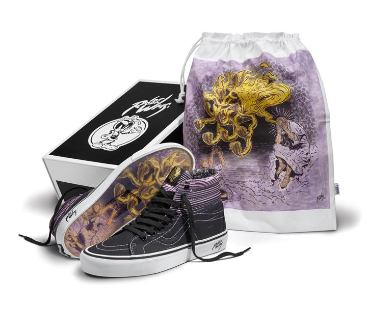 “In the late 20th and early 21st centuries, a new form of realism through paint presented perspectives that challenged the definition of fine art, focusing on the figurative graphics that formal art tended to reject: comic books, hot rod culture, surfer illustrations, movie posters and trading cards, to name a few. It was Robert Williams’ groundbreaking 1979 book, The Lowbrow Art of Robert Williams, that introduced the term “lowbrow” into the fine arts lexicon, fostering the evolution of “outlaw culture” in the art space. The Vault by Vans x Robert Williams offering features three prominent paintings by Robert that speak to this form of fine art including Flaming Cobras, Malfeasance and Jalapeña.”