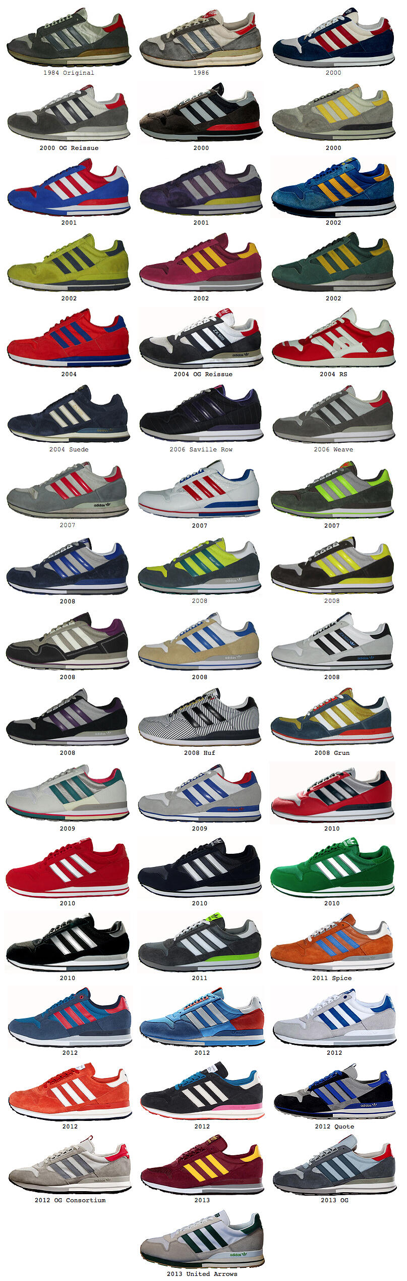 The ZX running shoe series was designed for runners when it launched in the 80s and numeric designations were initially given to each shoe, starting with the ZX 500 and ZX 800 in 1984 and 1986, and moving up to the ZX 4000 and ZX 5000 in the late 80s.